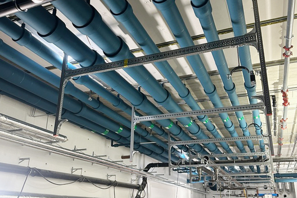 Västmanlands nya akutsjukhus är uppdelat i två sammanhängande huskroppar med var sin undercentral för värme och kyla. ”Den ena centralen är hela 50 meter lång. Här ska det in massor av pumpar och växlar med mera. Här kommer vi att komma in många gånger under projektet, och det blir trängre och trängre. Det kommer bli flera lager med rör. På ena stället har vi gjort det översta lagret, och under det kommer ytterligare ett lager med sex rör. Därefter kommer man inte längre åt det övre lagret.” berättar Magnus.