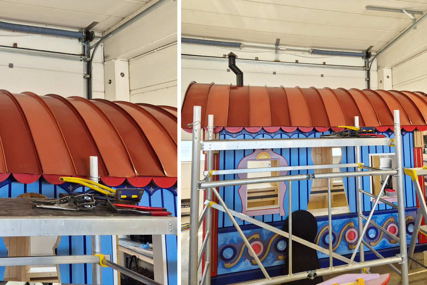 Tillsammans med lyckohjulet ska även en cirkusvagn levereras. Här gör Sjöholms plåtslageri en välvd bandtäckning i miniatyr.